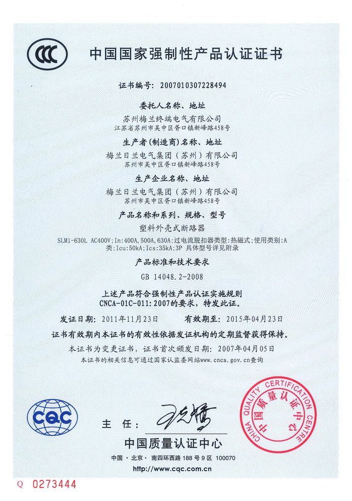 SLM1-630L塑殼斷路器資質(zhì)證書