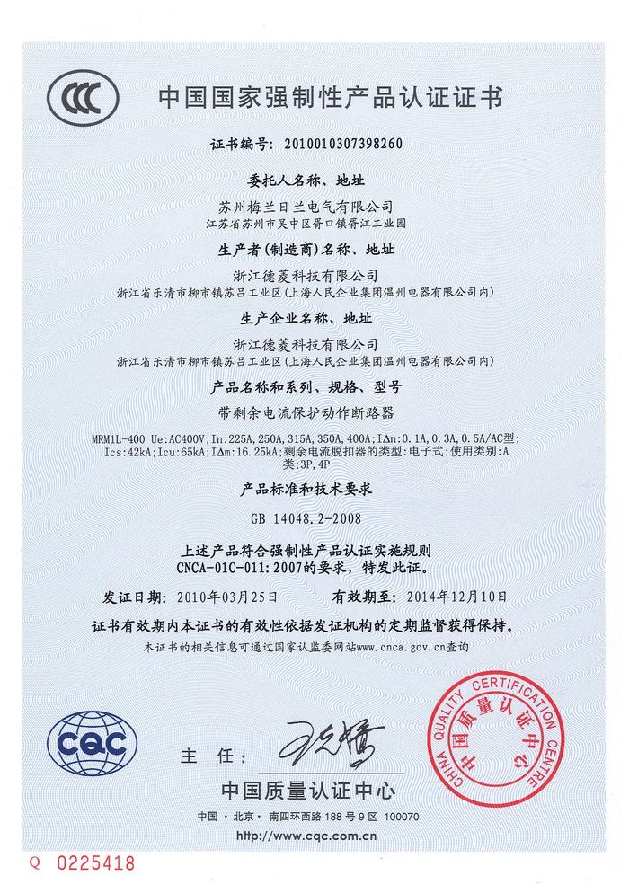 MRM1L-400塑殼漏電資質(zhì)證書