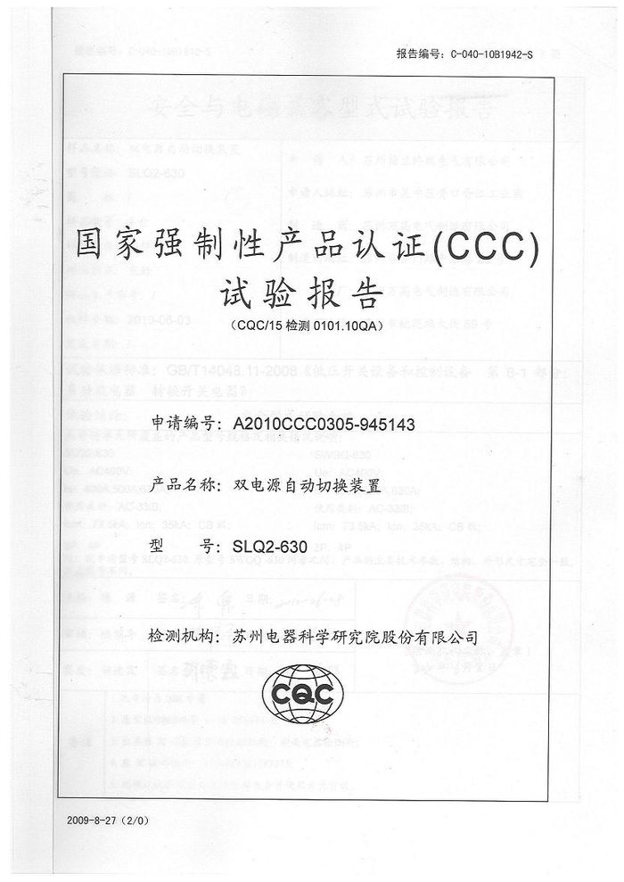 SLQ2-630雙電源資質(zhì)證書